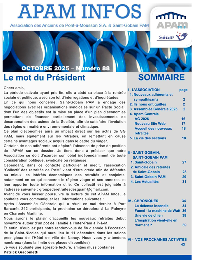 Ci-dessous la première page du n° 88 de notre APAM INFOS – Octobre 2025.